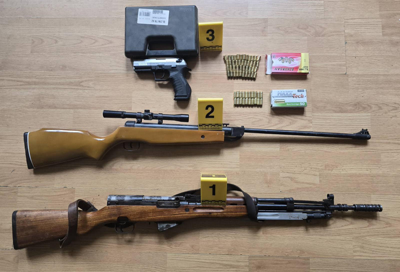 Prilikom pretresa pronađeni su i oduzeti: poluautomatska puška marke Crvena zastava, startni pištolj marke Blow, i vazdušna puška nepoznate marke, za koje imenovani nije posjedovao odgovarajuću dokumentaciju.