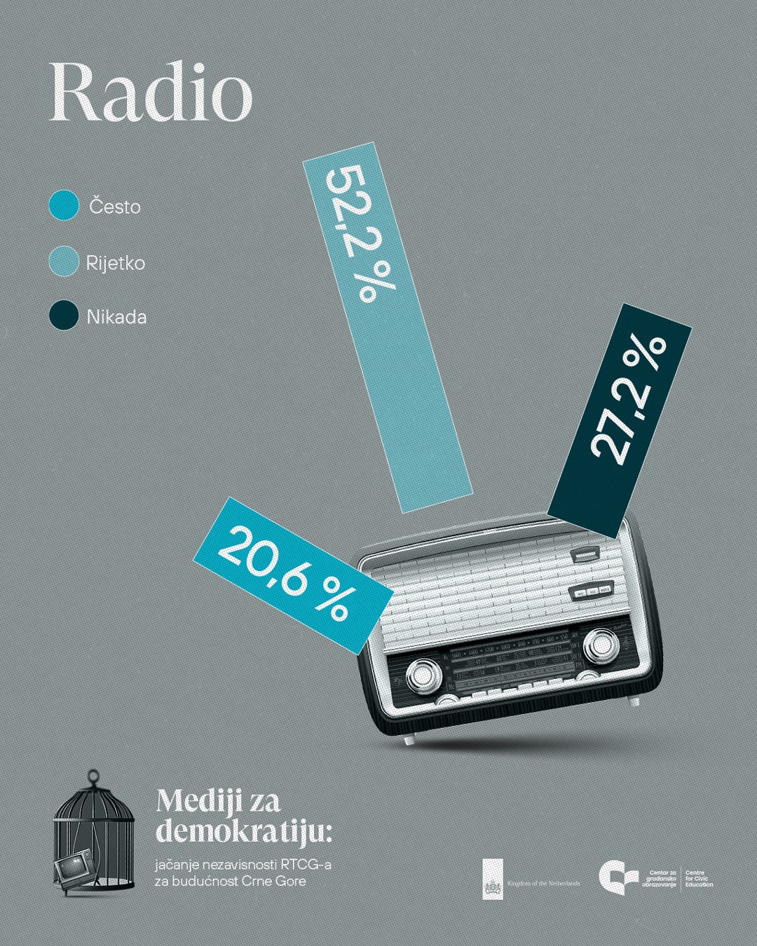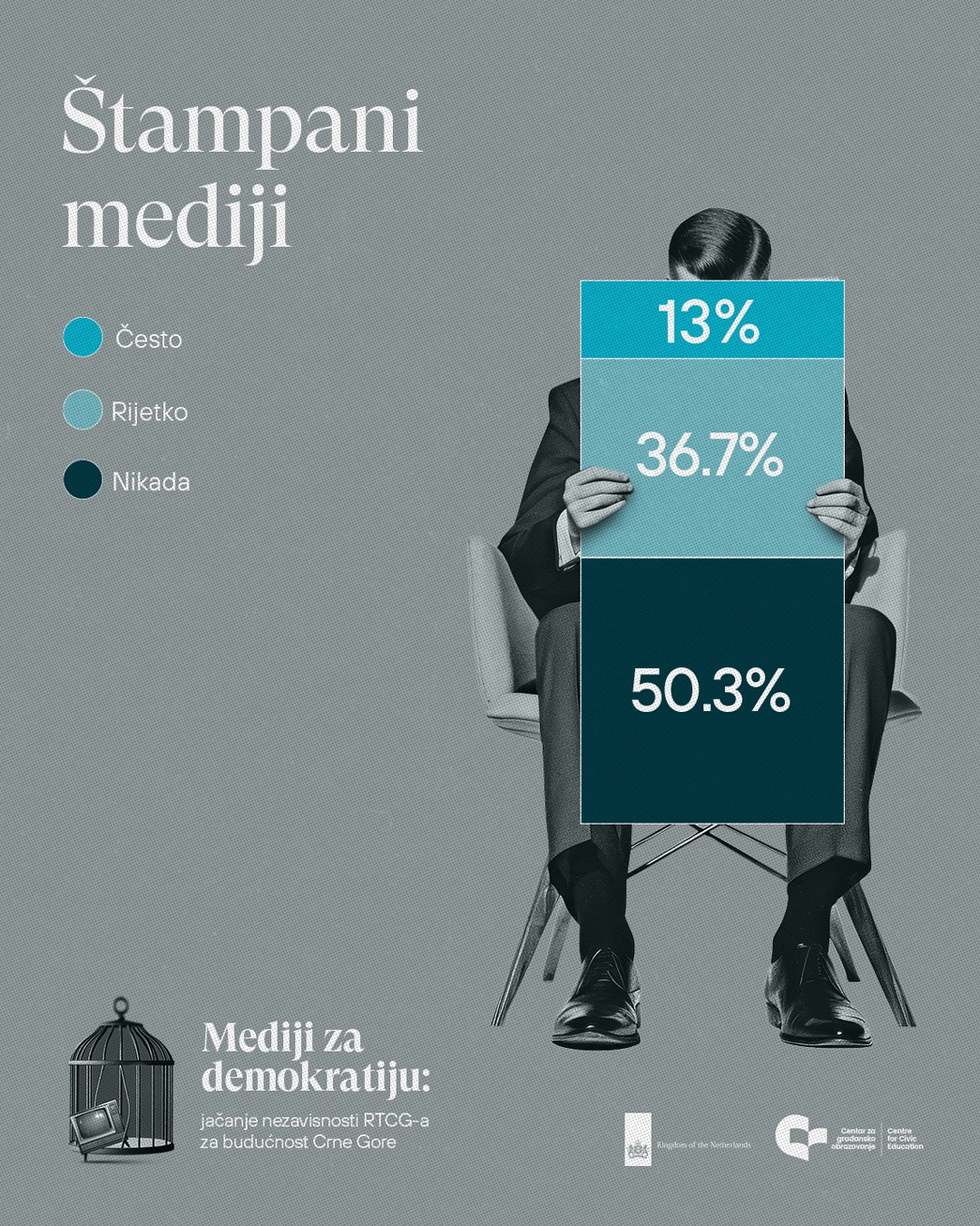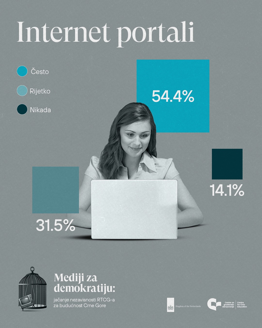 Iako mediji ostaju jedan od ključnih izvora informisanja građanki i građana Crne Gore, uz stabilnu dominaciju digitalnih medija, odnos građanstva prema njima postaje sve složeniji, jer to prati pad povjerenja u plasirane informacije, naročito na društvenim mrežama, pokazuje istraživanje Centra za građansko obrazovanje (CGO), sprovedeno u okviru projekta „Mediji za demokratiju: jačanje nezavisnosti RTCG-a za budućnost Crne Gore“, uz podršku Ministarstva vanjskih poslova Holandije.