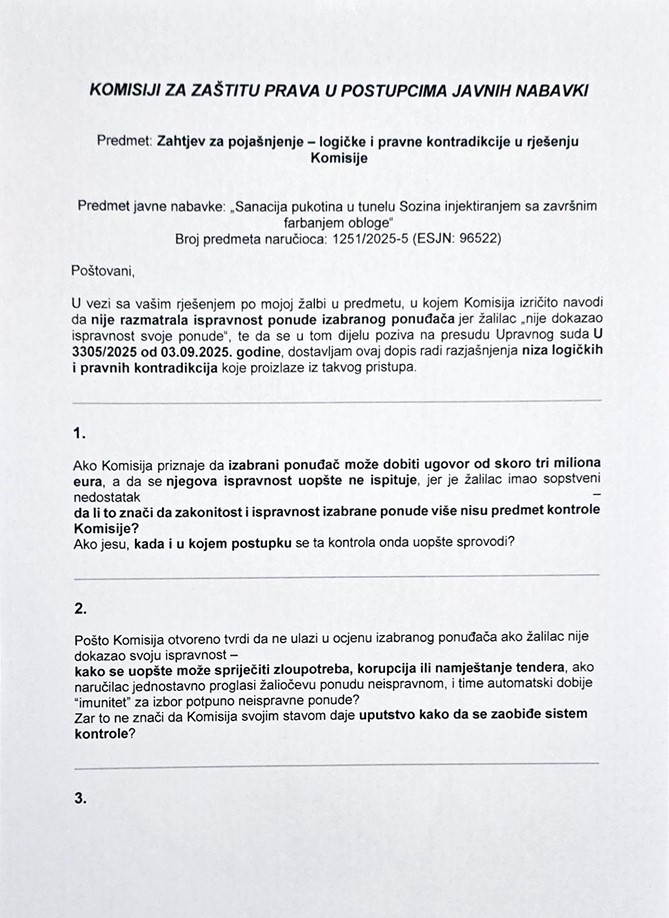 “Ta pitanja se odnose na osnovno pravno i moralno pitanje – da li se neispravna ponuda može proglasiti pobjedničkom samo zato što je žalilac takođe imao propust. Pitanja su u cijelosti dostavljena Komisiji, zatim i Direktoratu za politiku javnih nabavki, kako bi javnost i institucije imale uvid u način na koji se u praksi tumače i sprovode odredbe Zakona o javnim nabavkama”, precizirao je Marković