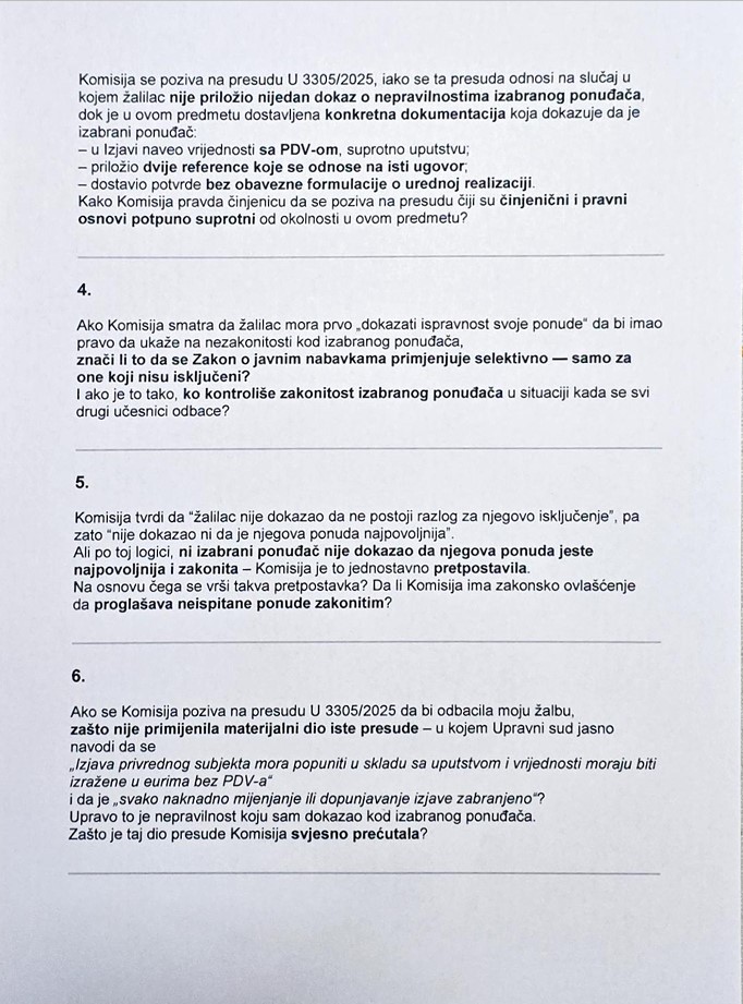 “Pitanja su precizna, konkretna i odnose se na logiku i zakonitost tumačenja koje Komisija primjenjuje u ovom i drugim postupcima, a koje – po svemu sudeći – omogućava da izabrana ponuda bude neispravna, nezakonita, pa čak i skuplja, samo zato što je žalilac označen kao neispravan. Takvo tumačenje faktički znači da, ako ponuđač koji uloži žalbu ima i najmanji propust, izabrani ponuđač može slobodno imati bilo koji nedostatak, jer Komisija tada odbacuje žalbu bez ispitivanja ispravnosti izabrane ponude. Drugim riječima – ako žalilac „nije savršen“, zakon prestaje važiti za druge”, kazao je Marković.