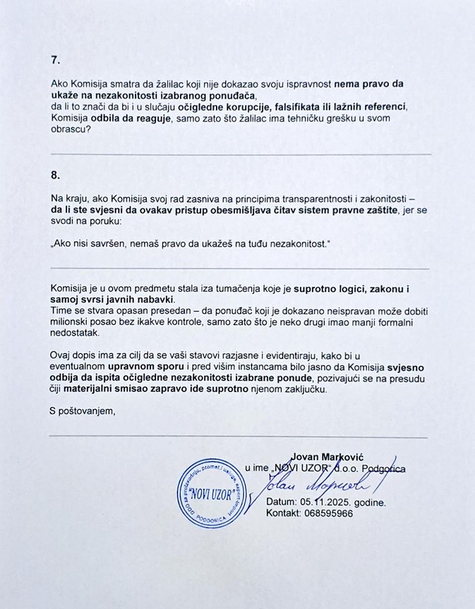 Firma NOVI UZOR DOO smatra da ovakav stav Komisije ne samo da narušava osnovna načela jednakosti ponuđača i pravičnosti postupka, već stvara opasan presedan koji će se primjenjivati i na sve buduće tendere u Crnoj Gori.