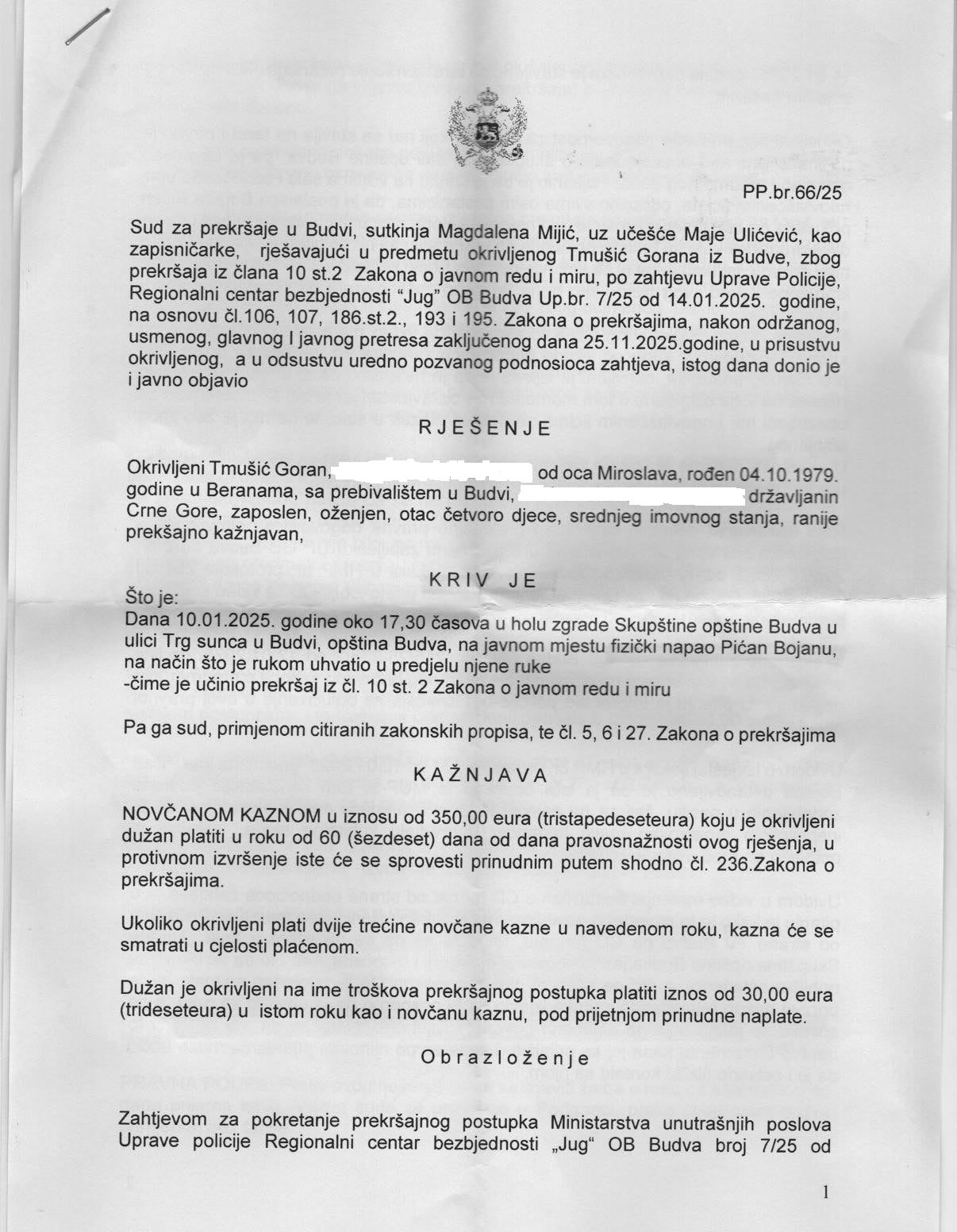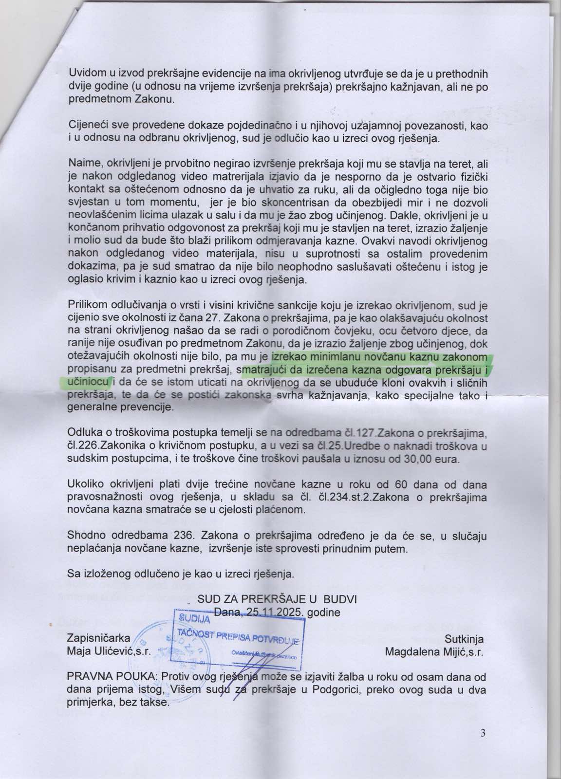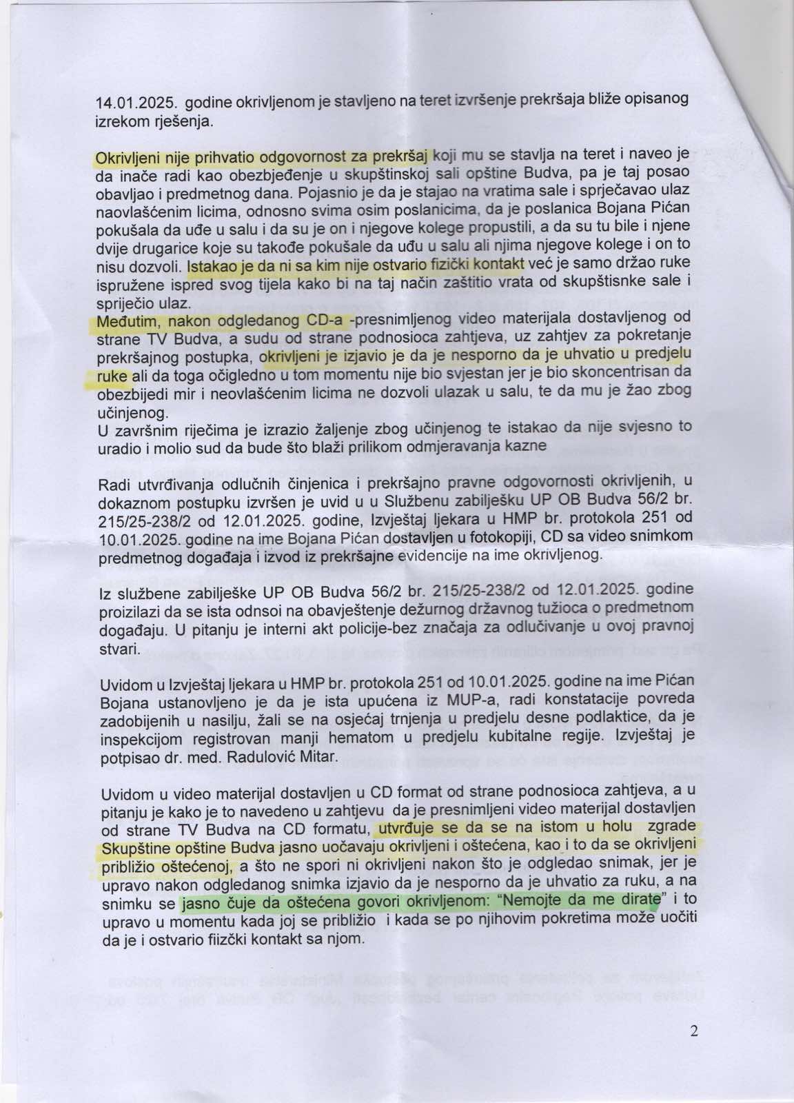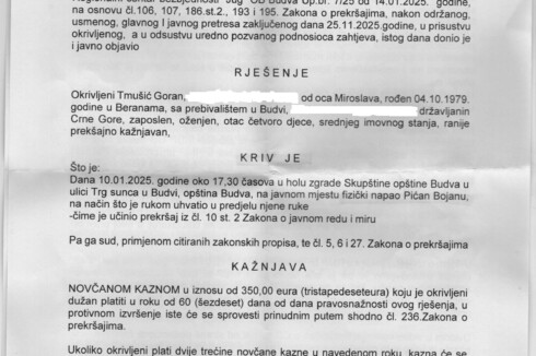 “Sud za prekršaje u Budvi, nakon više od godinu dana, uručio mi je presudu u vezi fizičkog napada koji sam doživjela 10. januara prošle godine, dok sam, kao odbornica, ulazila u salu Skupštine opštine Budva. Član obezbjeđenja mi je stisnuo ruku uprkos jasnom upozorenju da sam odbornica i da mi se mora omogućiti prolaz”, navela je Pićan.