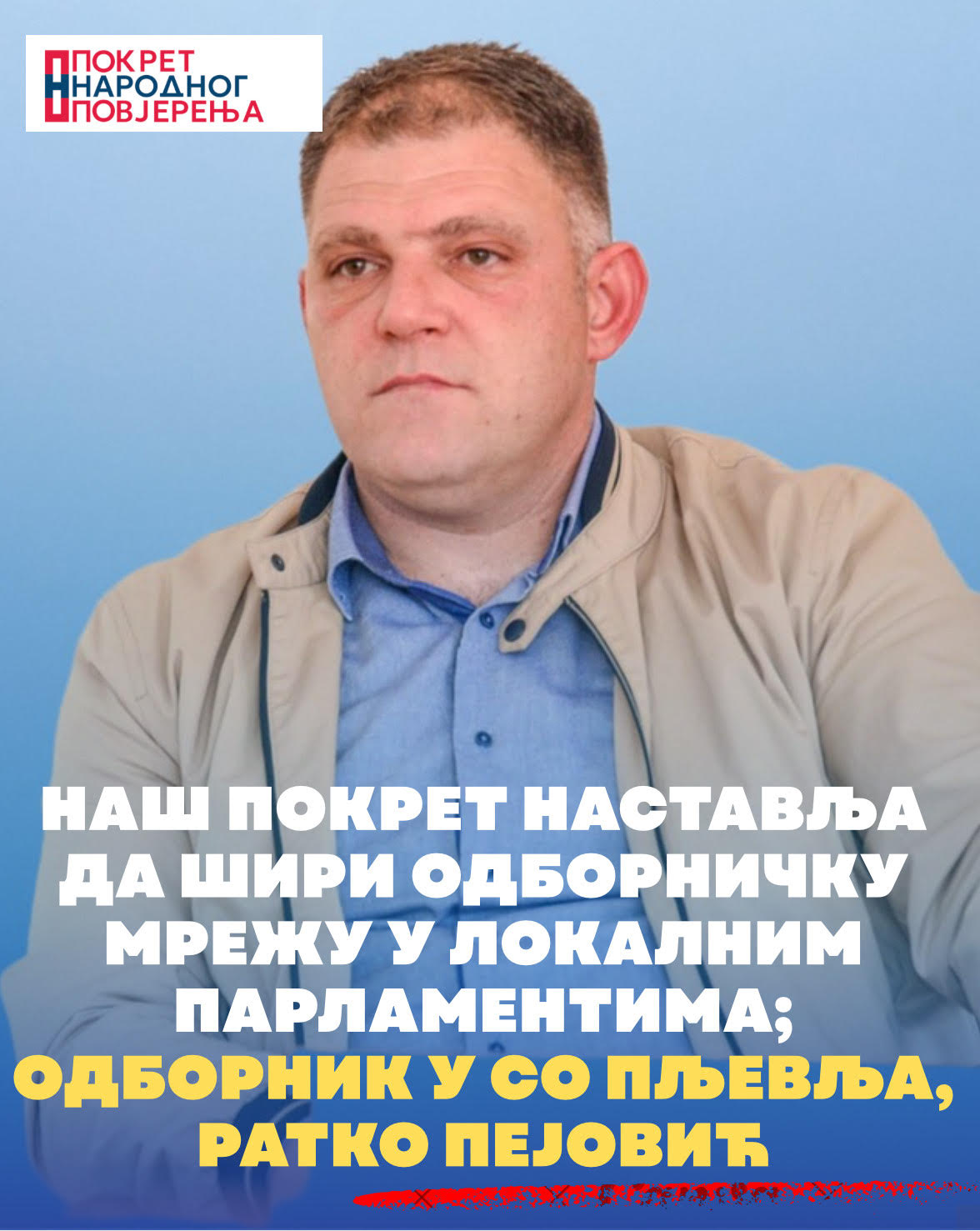 Pokret narodnog povjerenja je i formalno osnažen sa Ratkom Pejovićem koji ce kao nezavisni odbornik u Skupštini opštine Pljevlja zastupati politiku i interese ovog pokreta.